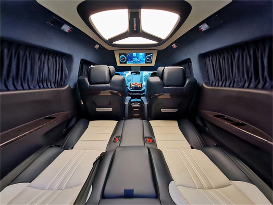 乘客舱采用超纤真皮包覆,地板采用的是游艇级的柚木实木地板的设计,既美观又大气。二排阿尔法同款航空座椅,通风、加热、电动腿托一应俱全,同时可进行旋转。上有星盾天幕顶灯,如同身处于高级会议室中,为您的业务洽谈带来极度的舒适感。同时半隔断电视在出行中带来很好的娱乐性及视听感受。