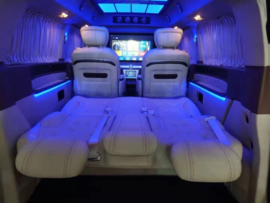 进入奔驰奔驰V250改装七座后舱,立刻就会被它的豪华绚丽而征服,驾驶舱与后舱是分隔设计的,形成两个独立的空间。中间由一台超大液晶升降电视(32寸)及多功能吧台及美国Bose5.1立体环绕音响家庭影院组合组成,整车环保真皮包裹,古巴丝网印地板铺设,极度奢华。