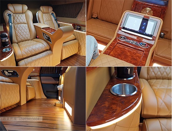 本改装厂主营改装项目一览表:航空座椅、三连座沙发、柚木地板、全隔断、带升降电视、半隔断吧台、吧台隐藏座椅、电动中门、电动尾门、导航、桃木方向盘、方向真皮包、覆仪表台真皮包覆、驾驶座真皮包覆、驾驶座电动调节、驾驶座电动加热、驾驶座电动通风、驾驶座电动按摩、驾驶座气动按摩、驾驶座加棉、驾驶舱鹿皮顶、后舱鹿皮顶、后舱星空顶、九宫格顶灯、ABCD柱鹿皮包覆、遮阳板鹿皮包覆、驾驶位门板真皮包覆、中门门板真皮包覆、后尾门门板真皮包覆、全车侧壁真皮包覆、全车私密手动窗帘、迎宾踏板、主副驾驶中央扶手箱、主副驾驶扶手带冰箱、吸顶电视、主副驾驶靠背小桌板、可拆卸小桌板车、内氛围灯、吊顶、其他。