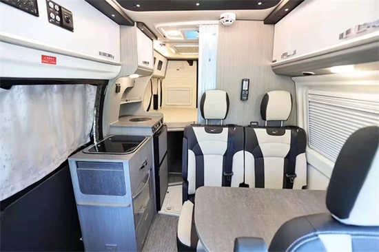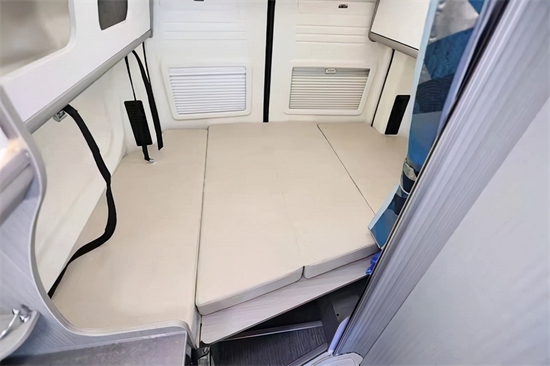 室内设计方面,作为瑞弗房车首款B级房车来说,室内色彩搭配非常不错,能给人一种耳目一新的感觉。驾驶室上方配备大尺寸钢化玻璃天窗,带有遮阳帘和防蚊帘。驾驶室副驾驶席可以享受旋转,紧接着生活区客厅部分采用双人单排座椅布置,带有可延伸的餐桌,可以形成一个3人简易会客区。