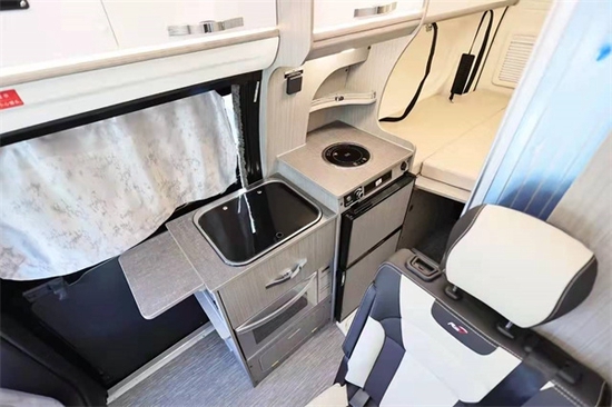 厨房位置靠中门,采用高低台阶式的两段设计,目的是增大厨房中冰箱的大容积匹配,配备一款弗罗斯特85升冰箱,电磁炉和微波炉均有配备。厨房内还有两个带分格的储物抽屉,分门别类放置其他厨房用品。好了本款瑞夫妻节R500福特全顺小钢炮小峰哥就同大家介绍到这里。阅览世间美好,带您跨越山河,品味人间烟火,给您一个移动的家 -我是小峰哥