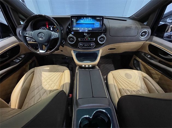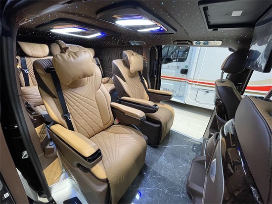 驾驶舱的配置也是不容忽视的一点,就控制系统来讲,中控是360环影,12.5寸的奔驰V级 同款中控设计,方向盘是桃木加真皮包覆,整个驾驶室包括两边门板,座椅,和脚垫都是真皮包覆。相对于塑料,纳帕真皮包覆可以显示出整个车内的高级感和质感。中央连体式扶手冰箱也成了商务车舒适配置的功能之一。