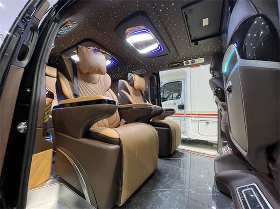 对于商务舱来说,两个航空座椅是值得关注的一个方面。带有通风,旋转,按摩,加热,腿托的所有功能,触摸屏控制10多项的电子调节,科技感满满。而且整车贴心的在扶手处,出门口的位置都做了镀铬和包覆的处理。