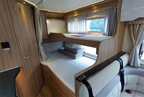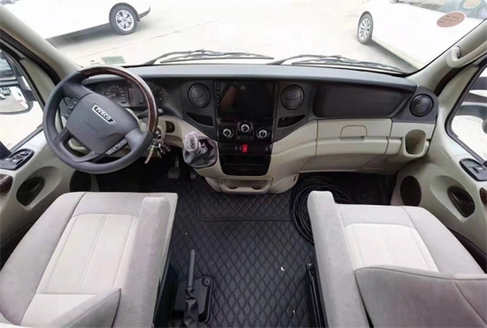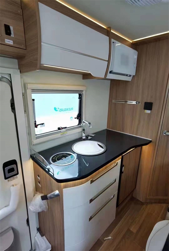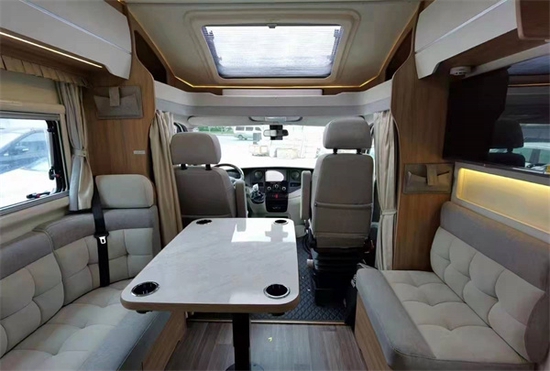 先看驾驶室,正副驾驶位均可旋转,中控区采用了黑白拼色的装饰,方向盘一端也做了类似桃木工艺的设计,搭配浅色的拼接座椅,整个驾驶舱的质感有所提升。上方的额头区做了大尺寸天窗的设计,为生活区带来了充足的采光,周围做了开放式储物格的设计,放置一些日常用的小型物品,拿取也非常方便,中间配置有小米音箱,能为乘车人带来有质感的影音享受。后方生活区的内饰布局从前到后依次为会客区、厨房区、睡卧区和卫浴间。内饰整体采用了进口原木色轻质环保板材+磨砂哑光皮料的搭配,营造出温馨的室内空间。