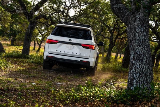 新款红杉尾部饱满,采用悬浮式车顶设计,Y形尾灯细长,车牌下方是一组Sequoia英文字标,标明其身份,Capstone版的底部则采用银色和黑色护板包裹,尾次感较强。TRD Pro版的底部为黑色涂装。