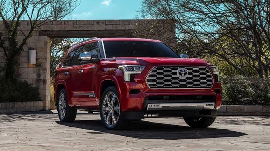 新红杉的外观造型立姿挺拔,看起来很硬朗,有点美式肌肉车的感觉,个人觉得比丰田兰德酷路泽还要帅气。车头类似于最新款的Tundra皮卡。有一个巨大的格栅,但设计师为不同车型提供了不同的网格图案,以区分它们的造型。例如,TRD Pro版采用更宽大的黑色六边形格栅,而Capstone版具有较小的镀铬装饰的格栅。中网两侧是Y形前大灯。