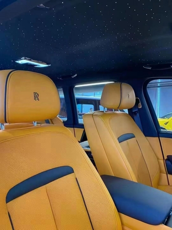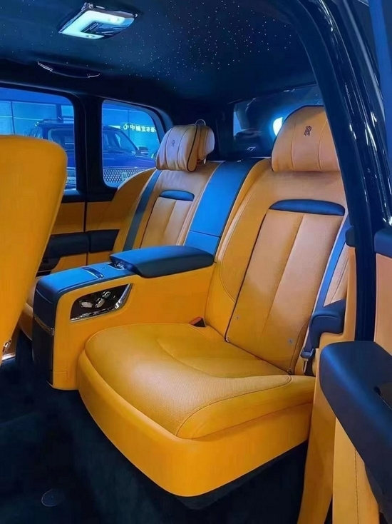 在Black Badge劳斯莱斯库里南中,奢华真皮座椅上的星空顶,作为新增的柔和光源,强化了车内的氛围。橘色真皮配合1344根独立光纤手工编织其中,绝妙还原了夜晚的星空。八颗绚丽的白色流星随机地在车顶划过,前排乘客的头顶出现流星的概率更大,十分巧妙地体现出这辆车对喜爱自主驾驶的客户的吸引力。