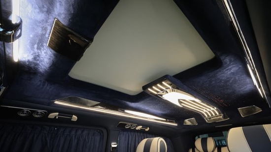 这款奔驰v260豪华保姆车整个内舱环境配色还是比较商务范的,阿尔坎塔拉麂皮绒包覆了整个车舱,顶部还加了一些辅助灯带,毕竟原车内真的太暗了,电动天窗也是基本标配。