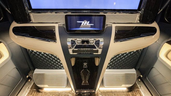 这款改装的奔驰V260长轴车型的吧台还是比较功能化的,中间这款小屏是可以操控车内灯光,电视等,比较有科技感。