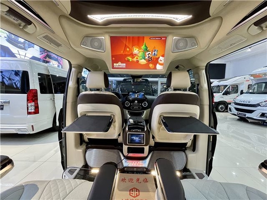 后舱配置独立办公小桌板,吸顶隔断互联网电视,环绕音响,独立控制总台,镀铬迎宾踏板,和全车铺设的高光镜面地板,凸显豪华质感。