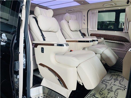 奔驰威霆改装7座商务车第二排座椅安装进口首席航空座椅,加热通风按摩功能齐全,最大限度的减缓您的乘车疲惫。奔驰威霆改装无高顶无隔断7座商务车八向电动调节:电动头枕,电动腿托,前后电动调节,电动靠背调节。