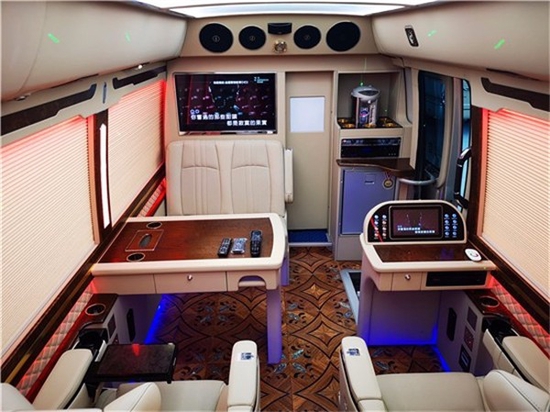 丰田考斯特在内饰的改装上更加注重尊贵的衬托,高档的豪华座椅暂且不说,自动调节的百叶窗帘也无需再提,就拿车载的影音系统来说,我们完全可以依靠自己的需要设计符合我们需要的车载影音系统,高清的显示屏,专用的麦克以及高级的扬声器设备,随时随地带给乘车人员一种舒适的享受。