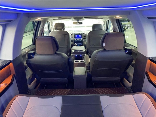 福特F150勇猛者7座越野高顶大型商务车,福特F150勇猛者越野的代名词,此款车的长度是目前所有车中能全国上牌符合国六标准的一款全尺寸大型越野商务车5.98米的长度,内部空间非常的宽裕,其霸气的外观,凶猛的前脸中网,在夜间更加的凶狠,接下来就让我们看看这款私人订制的越野商务车福特F150勇猛者商务车吧!!!车门部分的打造,利用仿实木材料,满满欧式复古的尊贵与大气。尽显高档生活的品质及值得玩味的文化内涵,这样的驾驶内饰才是其驾驶者独特个性和魅力的真正体现!