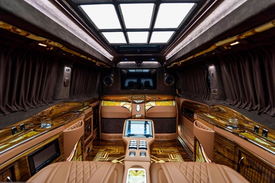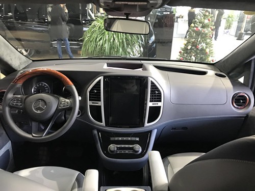 奔驰新威霆改装后还配有车厢内的灯光设备,按下按钮,车厢内顿时充满了黄色的炫彩灯光气氛以及漫天星晚上给人看星星的感觉。中控安装了14.1寸显示屏到时影响更加清晰可见还可以休闲娱乐,以及正副驾驶后面的商务桌板给了商务以休闲的功能,后面两个娱乐显示屏可让乘客更加休闲娱乐,商务人士可在会议过后利用车厢的灯光设备等,顿时让氛围轻松起来,可商务可休闲。吸顶电视设计使得车厢给人娱乐休闲的感觉,满天星顶会让您夜间行车抬头仰望,也让人有浪漫的星空臆想念头。倘若把周围的窗帘都拉开,闭上眼深呼吸,感觉与周围的环境很是融合,给人以心旷神怡的完美感受!