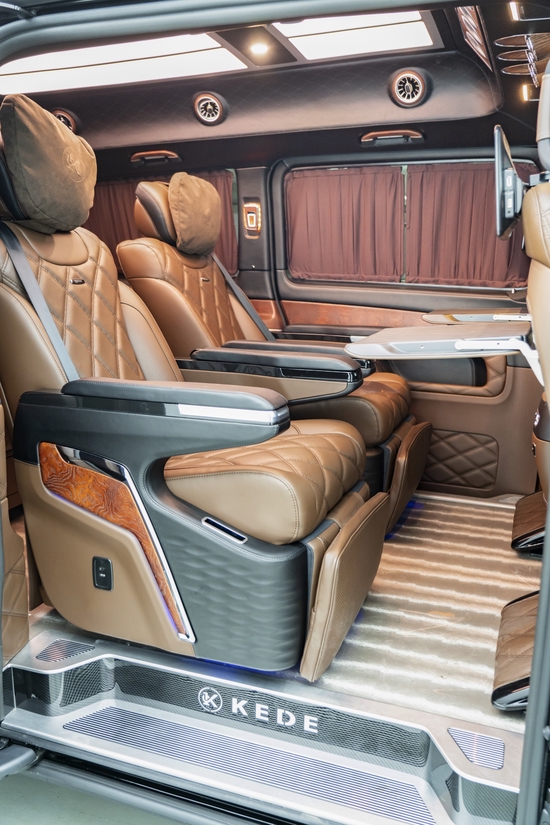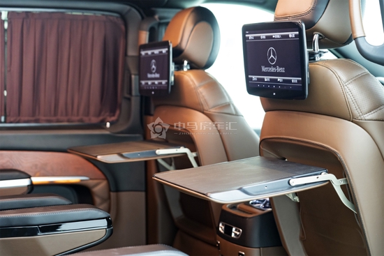 奔驰VST880在棕色的皮质色彩搭配下,坐在第二排的豪华头等舱座椅之上,让尊贵的老板时刻保持一个轻松愉悦的心情,二排小桌板、后排娱乐、无线充电、脚踏也都一一配置