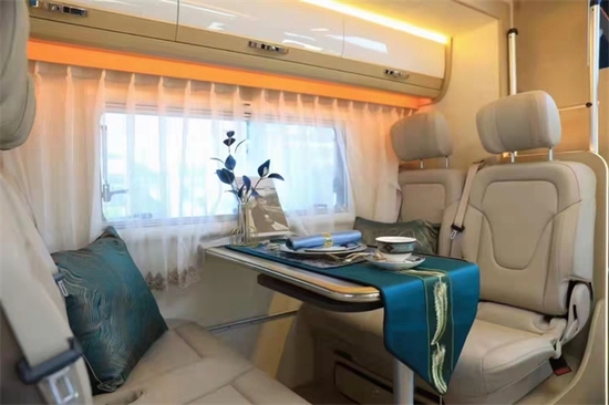 车身内部采用北欧风格的装饰,明亮、简约、大气。会客区采用对坐式卡座沙发设计,北欧风格布艺座椅造型,两侧座椅下方还有一定储物空间。搭配一张可升降式餐桌,临时可拼成一张沙发床;沙发内侧墙壁上有外推窗,推窗上方有储物柜,方便日常使用;卡座沙发后方则是一台152L赛特福德房车专用冰箱,冷藏冷冻都可以,不用担心食物变质,安全可靠;浅色内饰及顶部氛围灯则营造了温馨的家庭氛围。车内还配有进口DVD及音响等设备。