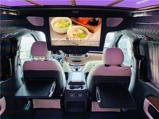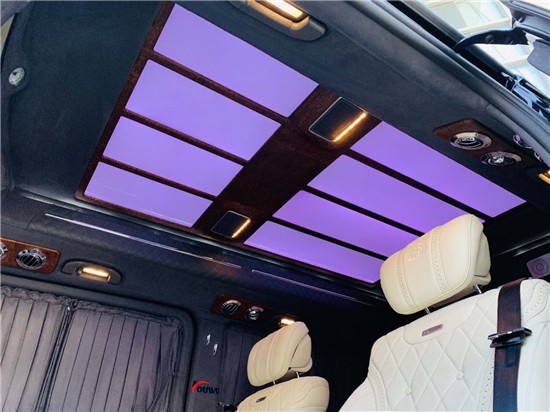 奔驰V250改装商务车全景电动天窗,随时随地赏云赏雨赏月,天窗的露出让你时刻感受惬意、放纵的自由,配合后半的迈巴赫式顶灯,满足商务接待、洽谈、出游等的需求使用。