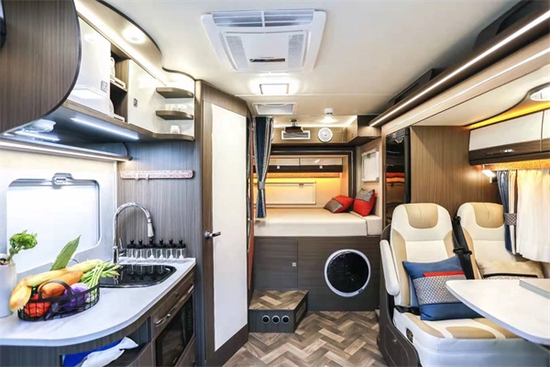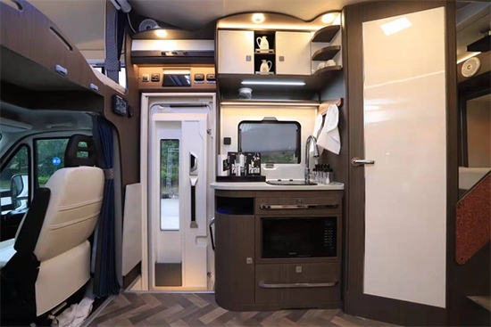 厨房区位于乘客门的右侧,占据不小的空间,配置非常丰富。操作台上配备了镶嵌式电磁炉和盖板的不锈钢洗菜池。电磁炉上方安装了房车专用油烟机,烹饪时开启,可以减少车内的油烟。抽油烟机的下方安装了外推窗,做饭时开启,可以减少油烟,平时可以增加车内的采光,改善空气的流通。
