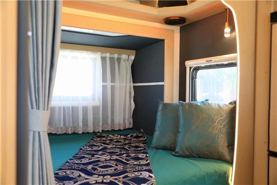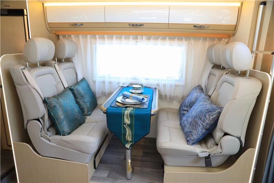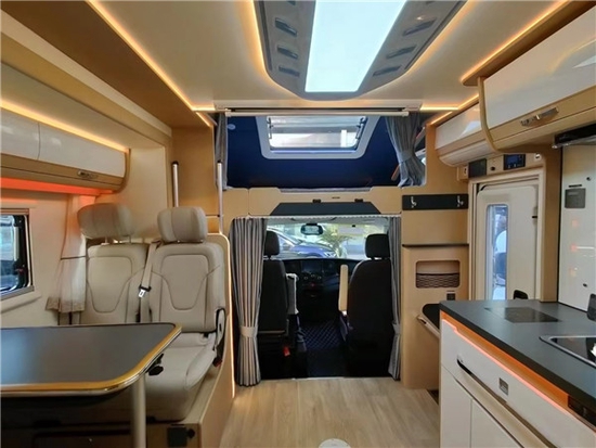 内饰风格采用的是意式风格,由著名的IDG设计公司设计打造。完美体现出简约,大气,温馨的氛围。以米色和浅棕色为主体配色,加上部分橙色的氛围灯,更显温馨舒适。会客区为4人座奔驰原装豪华沙发座椅+升降餐桌的组合,整体均位于拓展结构上,驻车时可扩展车内空间。在车内的娱乐设施上,并没有选用常见的额头床下方电视,而是配备有极米投影仪。因为采用的不是额头床电视的设计,额头部分的横梁不切,安全性更好、搭配进口JBL音响,可以完美体验到家庭影院的效果。