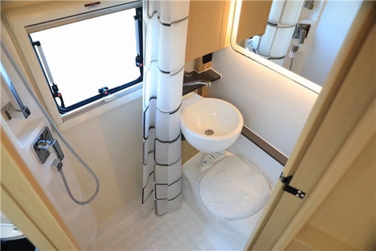 车内主休息区设计在车尾部,这张带尾部拓展的双人床开启后,适合睡下两个成年人,四周都安装了推窗,顶部是一圈环形储物柜,床垫宽大舒适,保证外出时也能睡个好觉。一体成型的卫浴间空间优势明显,配置有塞特福德固定式坐便器,独立淋浴系统,洗手池,进口mini洗衣机,换气扇,整体防水底托等设施。
