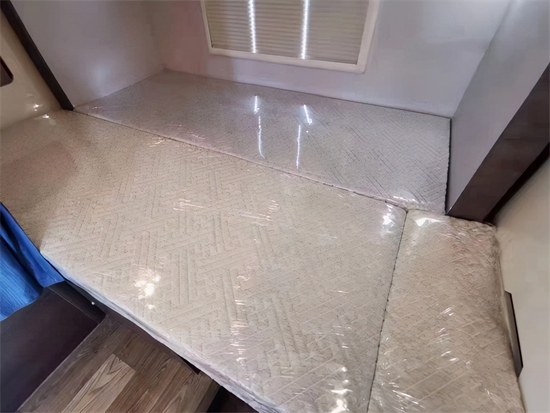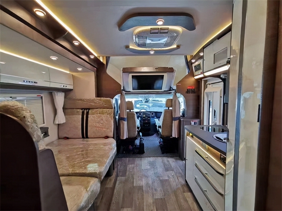 进入车内被这款房车金碧辉煌内饰的气势所震撼,在灯光的映射下,白色烤漆柜门以及晶莹剔透的玻璃门都在闪闪发亮,无处不彰显奢华。车内家具选用环保板材,地面铺设的是环保阻燃地板革。拓展舱打开后,内部空间极其宽敞,可以供一家人舒适生活,内顶安装了德国进口REMIS天窗。