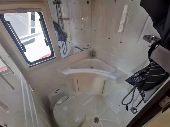 卫生间整体全白器具,带上点睛的木质纹理,简约时尚大气奢华 。卫生间配备赛特福德可旋转式坐便器,18L黑水箱,延边洗手池。整车采用伟巴斯特热水风系统。净水箱为180L,灰水箱40L。820安锂电池,500w太阳能板,还有三口拖车杠和驻车支腿,配置可谓是非常高了。