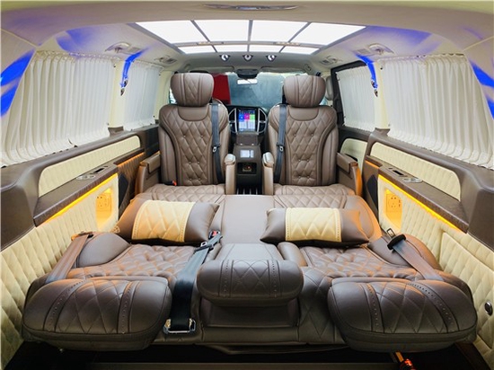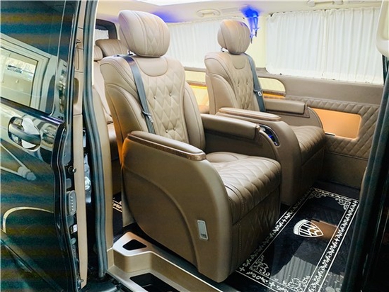 奔驰威霆整车环保真皮包裹,游艇级柚木地板铺设,奢华感无处不在,全部选用真皮制作,奢华木饰装点,带有按摩加热通风功用,后舱前为两个独立航空座椅,第二排座椅装置进口首席航空座椅,加热通风按摩功用完全,最大限度的减缓您的乘车疲乏,八向电动调理,电动头枕,电动腿托,前后电动调理,电动靠背调理,第三排为一组沙发座椅(可电动展平,形成一张舒适的沙发床)。