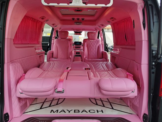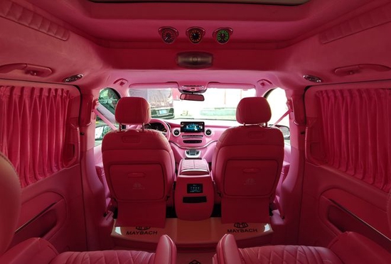 这款猛男芭比粉的迈巴赫VS980L全车采用了全车粉色内饰的设计,粉红色的桃木装饰板,粉红色的真皮包覆,粉红色的麂皮绒包覆,真是萌萌的少女心。