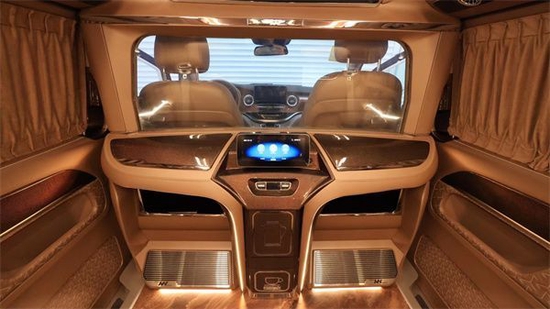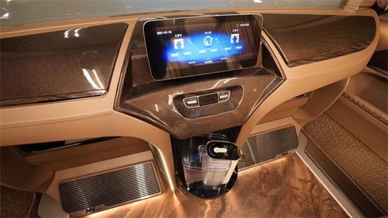 来到车内,全车大量使用真皮包覆,柔软舒适,高级感十足。一个隔断装置就是由不同的款式和功能组成,分别是无限电视机,雾化升降的玻璃,以及下方的吧台三部分组成。一来可以保证前后舱相对独立性,保证后舱的私密性;其次如果想要与驾驶舱交流对话,也可以直接升降雾化玻璃。多功能吧台高级皮革包覆,热水壶,两边是柏林之声音响,配合隔断处的大电视,看电视刷综艺,其乐无穷。