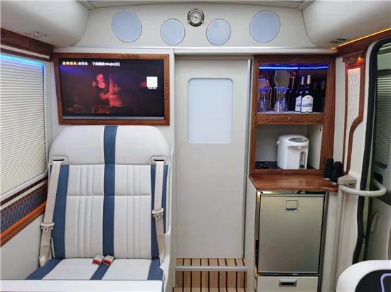 本台宇通T7定制12座红木版是前后仓隔断设计,固定式27寸高清三星电视,丹麦丹拿音响10.1、日本建武同轴,阿尔派五路功放。JVC的dsp、建武电视盒话筒处理器。重低音喇叭,音质配置上非常的好!酒柜,冰箱,热水壶,应有尽有,让领导出行更惬意!