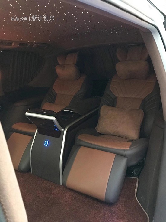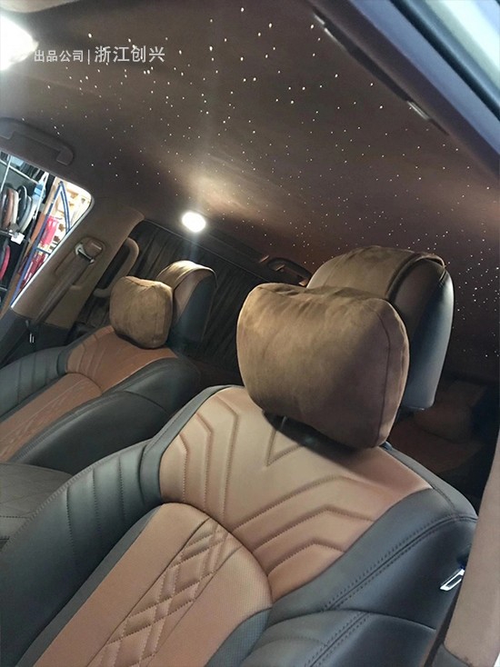 我平时市区用车的,或者跑跑长途和家人朋友等出去旅行,基本不去越野使用,所以可以改的比较典雅一些也没有关系,不必坚持太过硬派的改装风格,车顶的话除了包覆翻毛皮外我还做了满天星,增加了氛围感,看着有点儿气氛,航空座椅方面要重点说说,不然没什么可以介绍的了哈哈哈,升级航空座椅的好处是座椅靠背可以调节打倒,因为途乐原车的中排座椅除了腿部空间我觉得有点小外靠背比较直,坐久了腰累,升级航空座椅后有时候长途里我还可以把座椅打平睡睡觉,另外腿托也可以往上调节,是可以动的,大多数时候如果不是我开车的话我在后排都是半躺的一个状态乘坐,另外座椅有通风、加热和按摩功能,中间的手扶箱有个液晶屏是控制座椅功能的,另外手扶箱还有手机无线充电的功能和两个杯托,还有一个储物柜在里边。