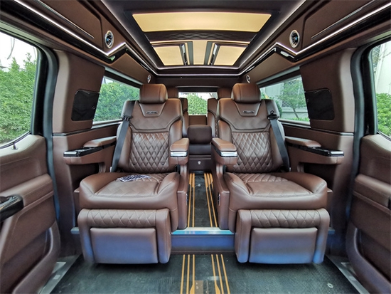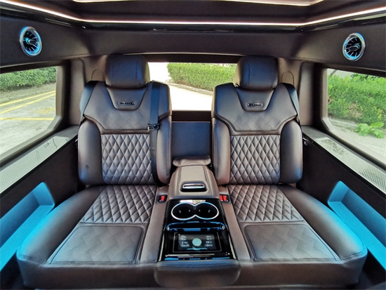 正副驾驶座椅后方独立的办公小桌板,碳纤维装饰条,在下方还有独立的后排控制按钮,可调节后排空调出风口,全车顶部光纤灯三色可调节,下方的空气净化器保障了车内完好的空气环境,全车采用高密度超纤材料地板,踏感更好;二排的座椅采用上等牛皮包覆的航空头等舱座椅,八项电动调节,前后,靠背,腿托,头枕,一键调节更加便捷舒适,座椅通风加热按摩也是必不可少;