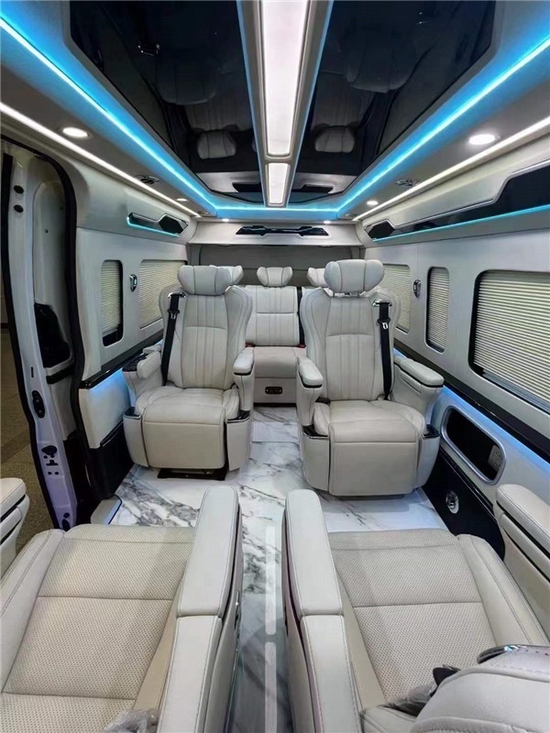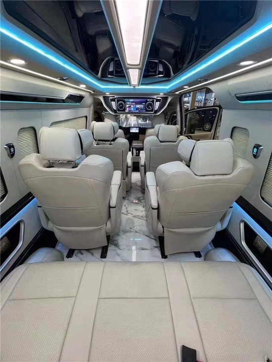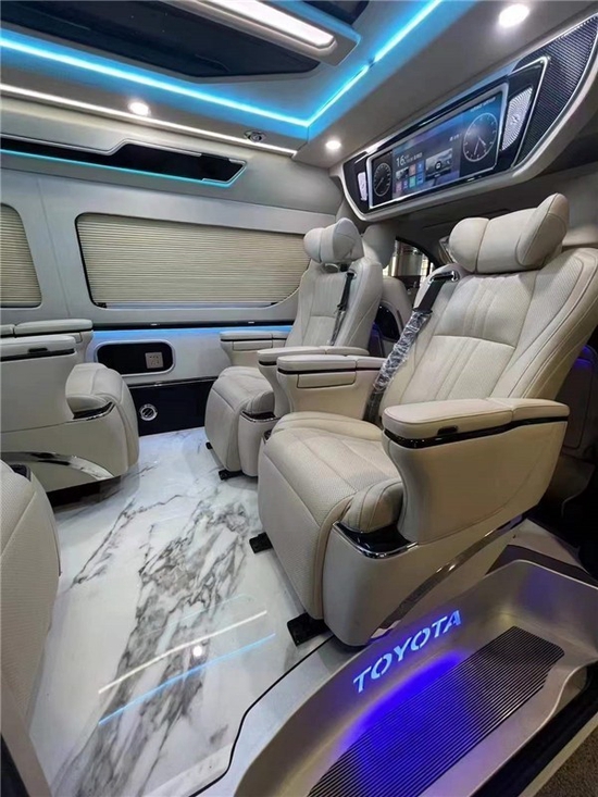 21款丰田海狮整车升级了加强型的隔音隔热处理,车内带空气净化系统,无线充电系统。在进门侧加装了氧化铝脚踏带迎宾灯的,整车都是采用纳帕级皮质进行包覆的,侧壁红木装饰,手动百褶窗帘,后舱暖风系统,最后说说棚顶灯光,这个有智能触摸控制系统。灯光超级棒。