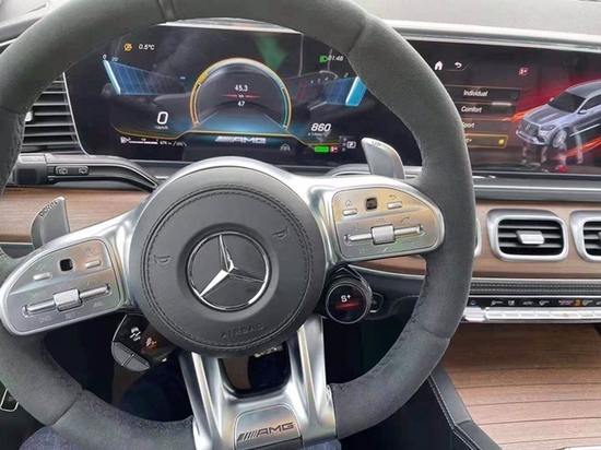 2021款奔驰GLS63特有的三幅式运动方向盘肯定是不能少,采用了平底设计,金属饰板加上周身真皮打孔的设计,握感非常不错,底部的AMG字样让你很有驾驶欲望。