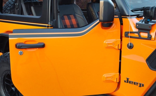 新款牧马人侧面则是以方正笔直线条打造,极富工业质感。熏黑式车顶十分吸睛,不过没有行李架略显遗憾。无边框车型堪称亮点,在时尚性上得到提升。加宽轮眉和防脱圈轮毂相得益彰,加上全地形MT轮胎,在山地之间该车也能够自如穿梭。锰钢侧踏板便于上下车,这也体现出该车设计时的细腻之处。