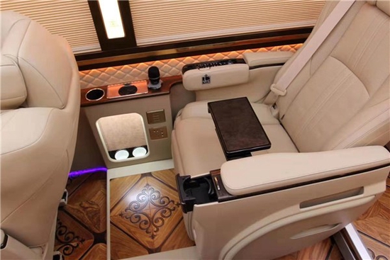 丰田考斯特4S店:北京华通丰业华北总代理12座丰田考斯特座椅改装最好用到真皮航空座椅专利航空座椅,多向滑动、旋转、按摩、加热、还有座椅呈包围形式对身体保护面更大。座椅颜色的变化让车内更具温馨感。