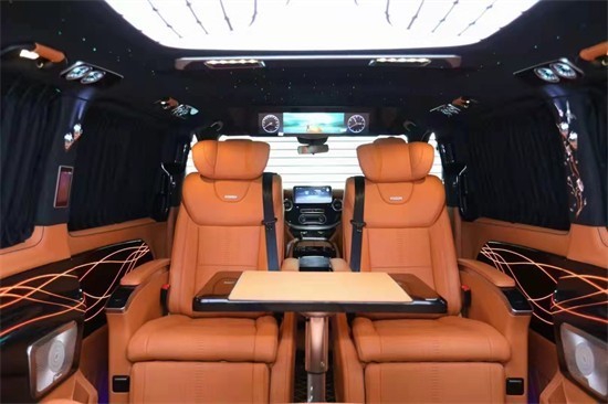 奔驰威霆商务改装车是在奔驰威霆裸车基础上进行改装,包覆显示屏。主副驾驶以及侧门进行软包,进行隔音处理,以降低车内噪音,奔驰威霆该装商务车主副驾驶换V级原厂冰箱制冷恒温功能,改装V级中控台。