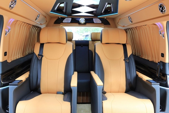 (购车订车请拨打附于公司简介处的联系方式)现车在售车型,隔断奔驰v260商务车改装,这款v级商务房车的时尚感爆棚。整车尺寸 ( 长 x 宽 x 高 ) (毫米): 5370 x 1928 x 2100,发动机: M274汽油发动机 涡轮增压 缸内直喷,变速箱: 7G-TRONIC PLUS 7速自动增强版,两侧是电动移门,尾部是电动上掀式尾门,顶部是全景天窗,整车大面积采用意大利人工创意环保面料Alcantara包覆。