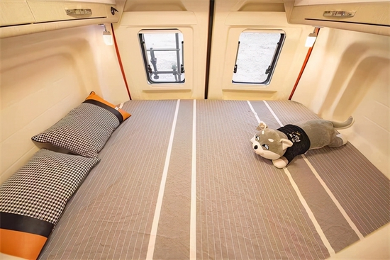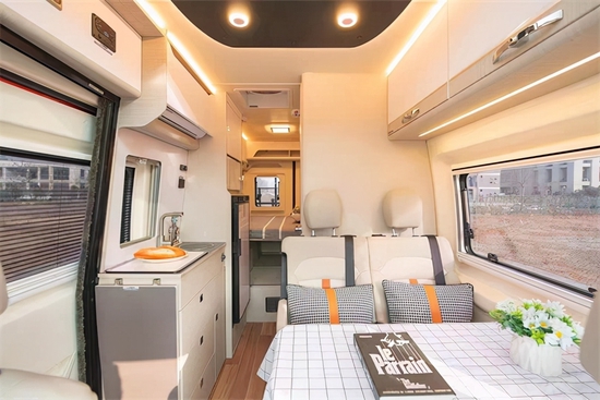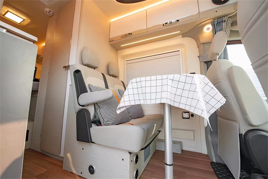 正对乘客门的会客区内提供了两个单人的沙发座椅和一张可移动的升降餐桌,座椅全部采用的是乘用车级别的材质,并配有行车扶手,可以缓解乘车过程中的疲劳感。升降餐桌不仅可以选择在车内就餐、工作使用,也可以移动到车外作为小餐桌使用。另外沙发座椅带有两条安全带,所以整车在行驶过程中最多可以核载4人。