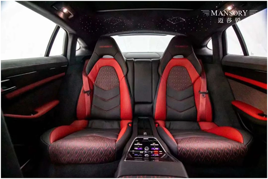 抛开“碳香四溢”的外表,迈莎锐·帕拉梅拉重塑后的奢华内饰也大为“吸粉”:无论是Mastrotto黑红双色真皮搭配Alcantara环保麂皮绒的全车包覆、无处不在的碳纤维饰品点缀还是MANSORY为帕拉梅拉重新设计的RGB流星星空顶,都凸显出一种让驾乘者心悦诚服的奢雅个性。