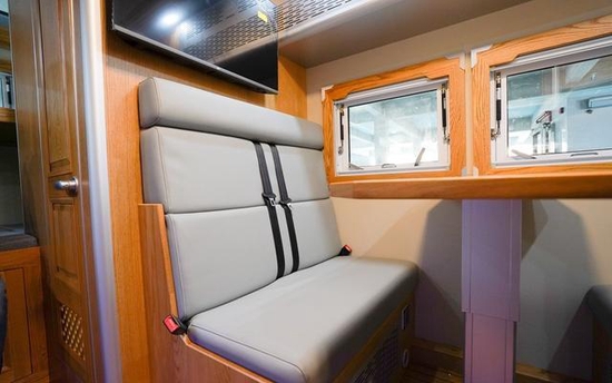 尾部横置上下床很好的利用了该区域的空间,床垫支撑性好,提供了不错的平躺感受;上铺翻转式单人床收起后不占用空间,增加了整体区域的活动范围,阅读灯及充电功能也满足日常看书及娱乐需求。床铺下方与尾部储物舱相贯通,取拿物品方便。