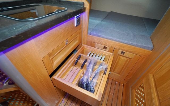 重汽豪沃越野房车更是配备了全套德国品牌厨具,带锁的抽屉和橱柜保证了汕斯特越野时厨房里会一片狼藉。汕德卡越野房车的厨房重地当然少不了电磁炉啦,油烟机通风口样样俱全,想吃什么就看您的厨艺咯,电磁炉旁配备了洗菜池,是不是很周到!