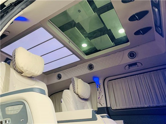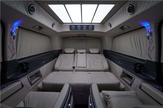 奔驰V260迈巴赫VS980房车贵宾舱则用采用豪华皮革、麂皮绒包覆,前后舱采用32寸高清液晶电视+吧台的实用隔断,柏林之声5.1殿堂级音响环绕系统+万国表+6.5寸电子触控屏+独立空调控制开关组合,给您舒适与娱乐相结合的享受。
