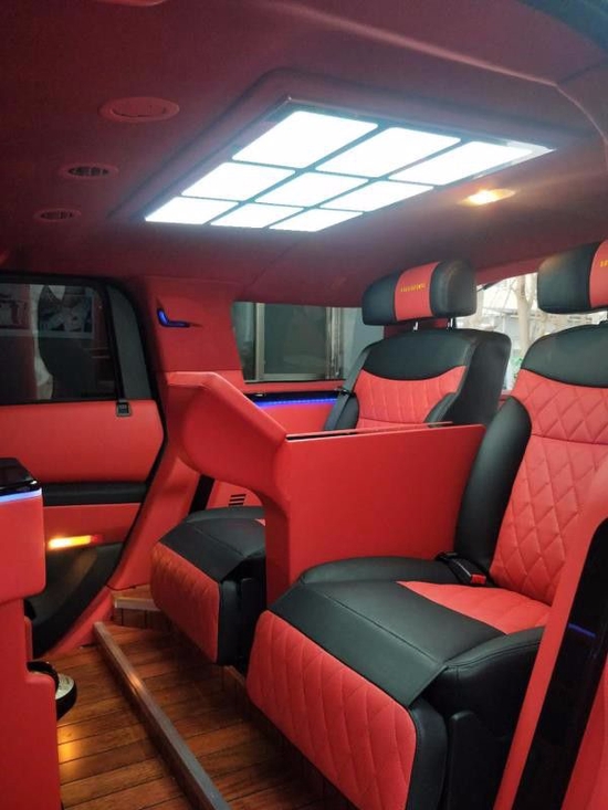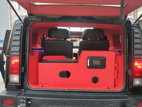 悍马车内变成了四座布局,中间放置了一个小隔断吧台,地板采用游艇级柚木地板,车顶是九宫格顶灯和星空顶,颜色变换多,这些配置的搭配和豪华商务车内饰相似,坐在越野悍马上就能享受到豪华商务车的体验。