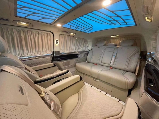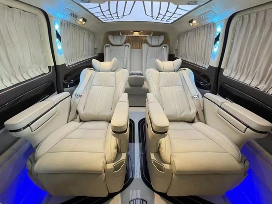 奔驰威霆无隔断式设计,主副驾驶座椅后方安装有手动小桌板,可承重10公斤,娱乐影音配备齐全,吸顶高清液晶电视,需要时可以往下翻,按钮一按,最新热点、时尚资讯随时掌握。 奔驰威霆改装最舒服的座椅:奔驰威霆乘客舱第二排多功能航空座椅,可180°旋转,并带有脚托功能,舒适乘坐,附有加热、通风、电动调节、腿托、按摩、记忆、电动头枕、电动靠背、电动肩部支撑等功能,座椅支持180度旋转。此款奔驰威霆第二排与第三排之间有可拆卸便捷式商务桌板,可进行商务洽谈,商务洽谈可放置电脑、文件等物品,旅游无聊时打娱乐,使用方便快捷。