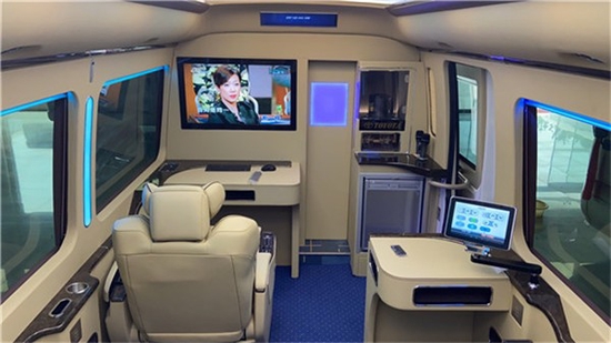 丰田 考斯特 商务车 豪华版在车内增加全隔断的设计,可以让驾驶席和乘客席之间成为两个独立的空间,为乘客打造了更舒适更隐秘的乘坐空间。其次从安全性能上考虑,增加前后隔断的可以让司机有一个安静大的驾驶环境,同时也可以带给乘客一个舒适的乘坐空间、最后就是从实用性上来说, 丰田 考斯特 增加隔断的设计还可以让我们在隔断上增加电视显示屏以及电子时钟这些设备。