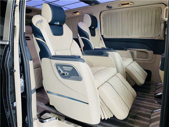 奔驰V260L商务车后排电动沙发座椅每个座位都备有单独的安全带,除了皮质触摸感跟填充物的舒适性相较于原厂车型有大幅提升之外,更可实现单项调节,这样坐在第三排也很舒服,商旅途中更惬意、自在的乘坐享受。