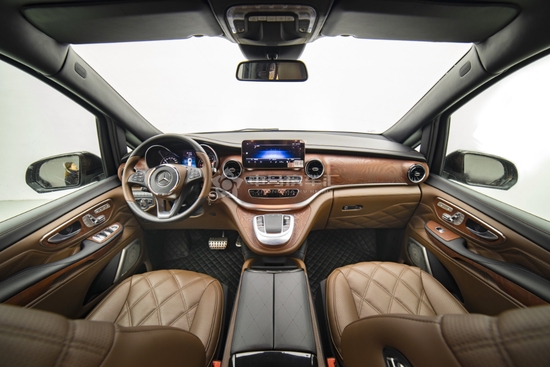 奔驰VST880在棕色的皮质色彩搭配下,坐在第二排的豪华头等舱座椅之上,让尊贵的老板时刻保持一个轻松愉悦的心情,二排小桌板、后排娱乐、无线充电、脚踏也都一一配置
