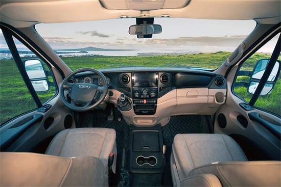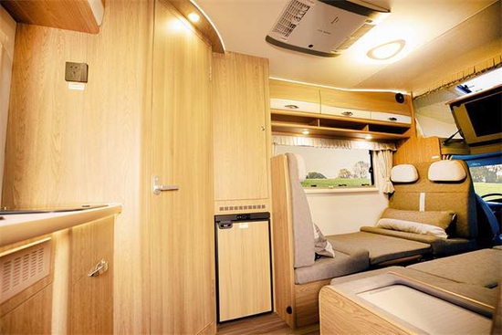 动力方面搭载3.0T柴油涡轮增压发动机,传动系统匹配8速自动变速箱,最大功率125kW,最大扭矩400N·m,核载6人,可上蓝牌持C本即可驾驶,符合国六排放标准。倒车影像及倒车雷达等配置保证日常停车时的安全及便利性。核载6人。车内布局从前往后顺序依次为驾驶舱、额头床、中部会客区、厨房区及卫生间。驾驶舱副驾驶座椅带有旋转功能,便于车内人员交流;上方额头床尺寸为2100×1200(mm),满足两名乘员休息;顶部超大推窗保证采光及空气流通。额头床翻折起来是一台高清液晶电视;此外配有航海级防水超薄喇叭。