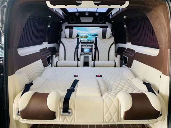 内饰通过改装实现了满足商务接待、洽谈、出游等各种出行需求。全车真皮包覆质感十足。然后它的第二排的座椅也达到了飞机头等舱的标准,手感细腻的进口纯手工真皮包裹,配有精致缜密的缝线,细节之处随处可见。不仅看上去更有档次感,而且在您坐上去之后就能感觉到它完美的衬托感!还具有多向电动调节等功能!它不仅可以让乘客更好的休息,也还可以和后排的人一起下棋或者打麻将,因为这个座椅可以旋转到后方,这样就可以轻松的娱乐了,座椅具备了通风和加热、按摩、记忆功能,整车配置强大,说不出一个不好的理由。